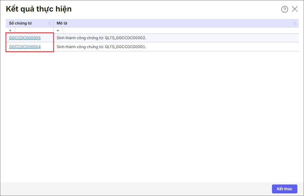 - Nhấn vào Số chứng từ tại Kết quả thực hiện để xem chi tiết.