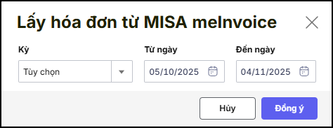 3. Chương trình hiển thị màn hình Lấy dữ liệu từ MISA meInvoice, chọn kỳ và ngày lấy hóa đơn, nhấn Đồng ý.