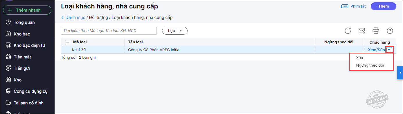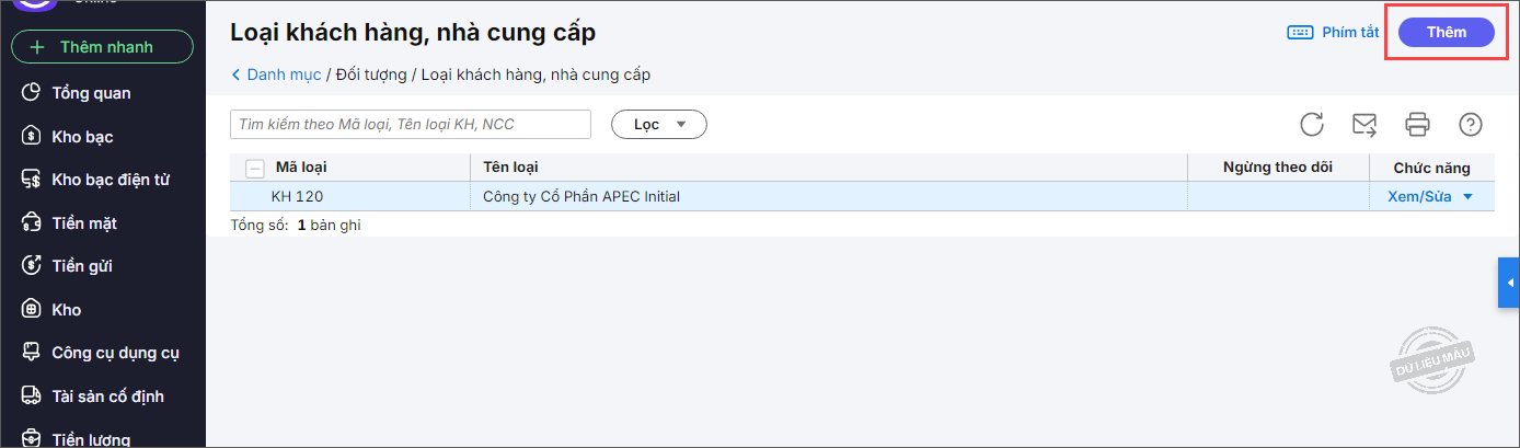 2. Để thêm mới loại khách hàng, nhà cung cấp, nhấn Thêm.