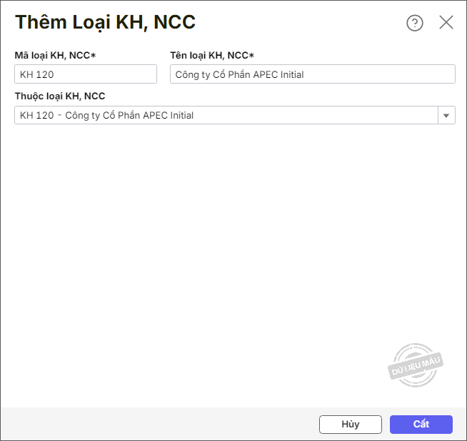 - Nhập Mã, Tên loại KH, NCC.