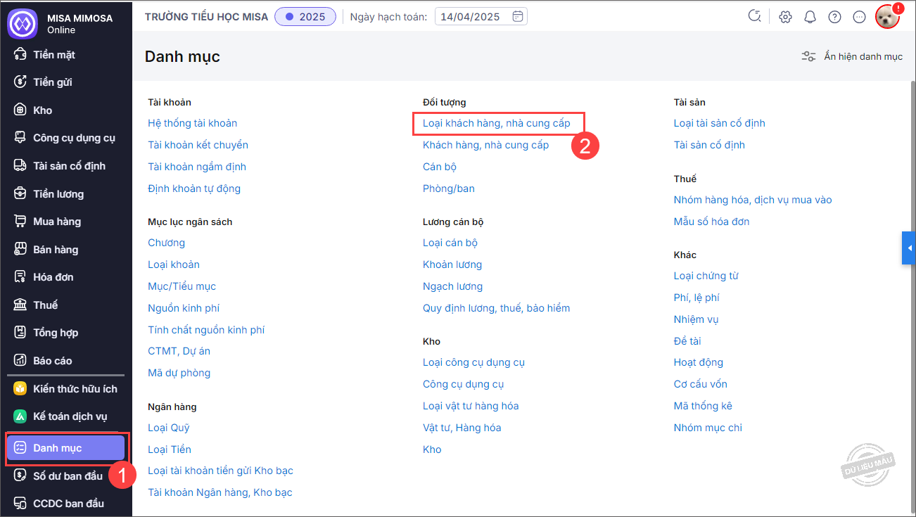 1. Vào menu Danh mục, chọn Loại khách hàng, nhà cung cấp.