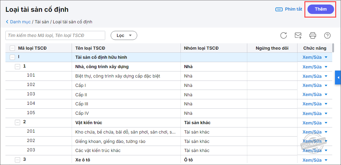 Bước 2: Để thêm mới loại tài sản cố định, nhấn Thêm ở góc phải màn hình.