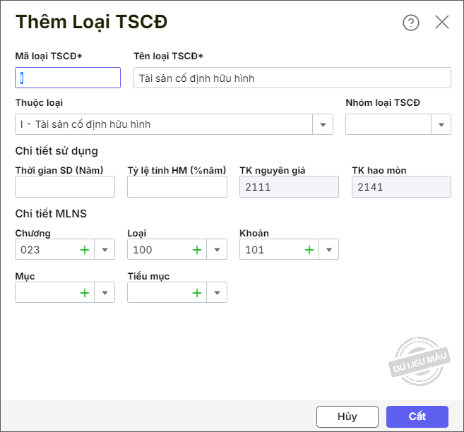 Bước 3: Phần mềm sẽ hiện thị ra giao diện khai báo loại TSCĐ mới, thực hiện khai báo các thông tin sau: