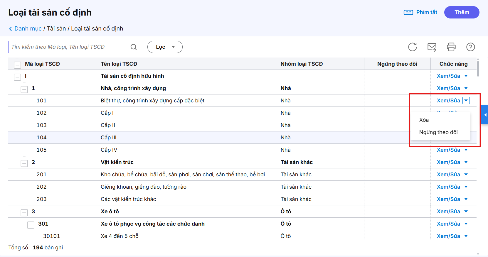 Bước 2:  Tại dòng loại tài sản cố định cần xóa, chọn vào biểu tượng mũi tên ⏷ và chọn Xóa