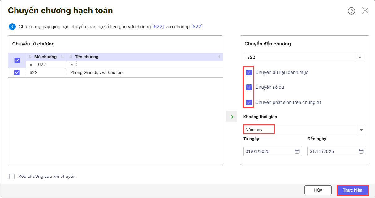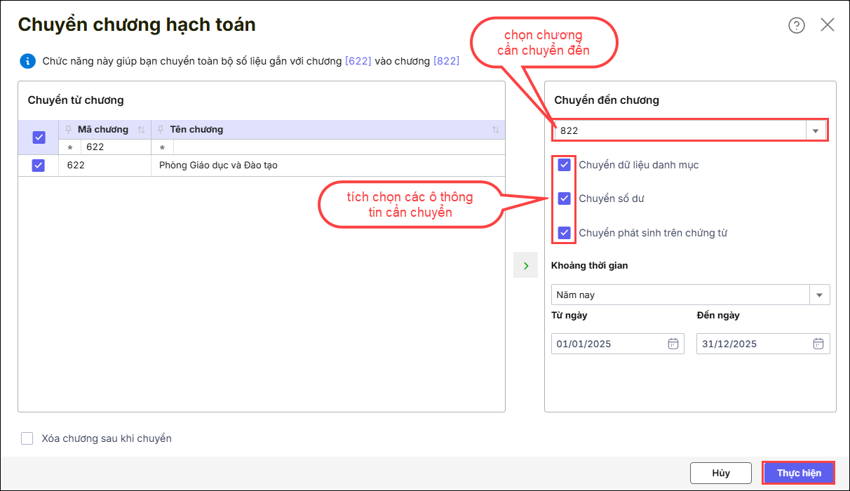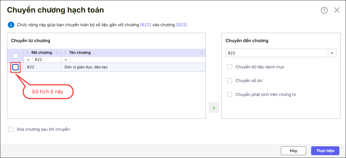Bước 1: Tại phần chương chuyển đến/Chọn chương cần chuyển đến, ví dụ chuyển từ chương 622 sang 822 thì chọn chương cần chuyển đến là chương 822.