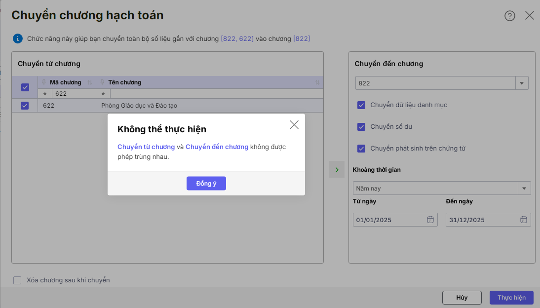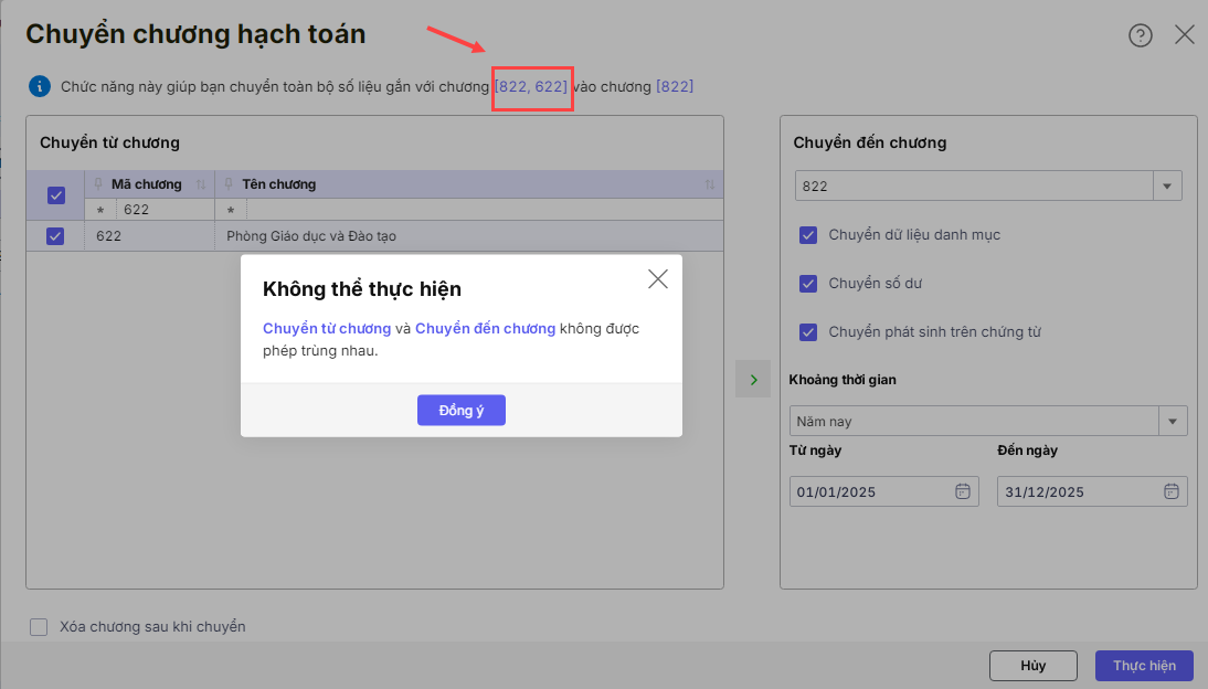 Do đơn vị chọn chương chuyển đi trùng với chương chuyển đến. Ví dụ như hình: đơn vị đang chọn chuyển từ chương là 822 và 622,chuyển đến chương là 822 nên đang bị trùng chương 822.