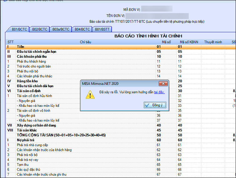 • Lỗi chung “Đã xảy ra lỗi…” khi xuất khẩu báo cáo tài chính.