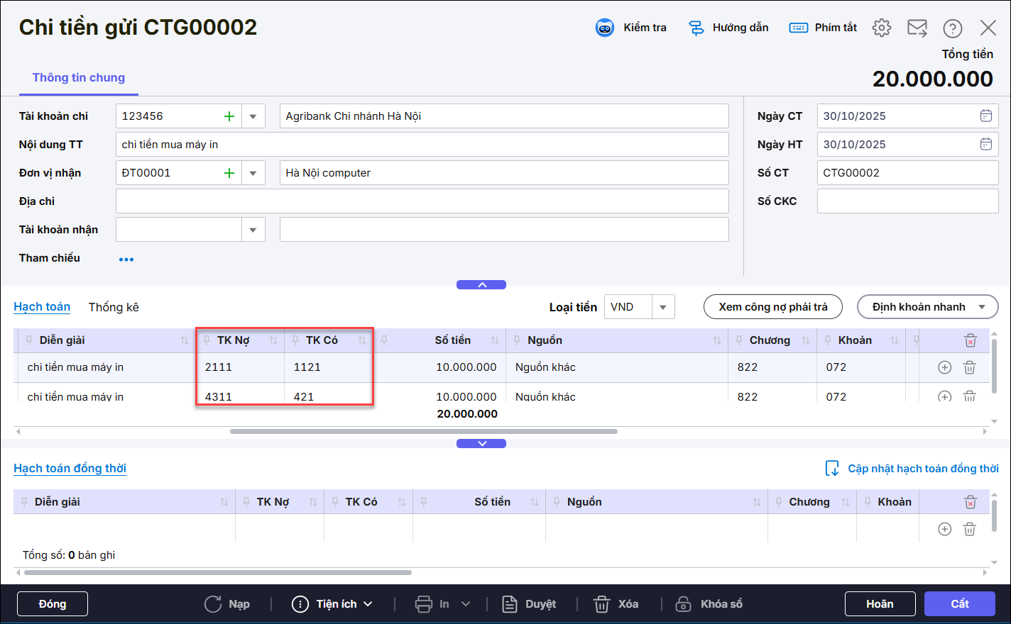 - Nhập chi tiết chứng từ: Nguồn Khác, Chương, Khoản, Tiểu mục, Số tiền, Cấp phát, Nghiệp vụ.