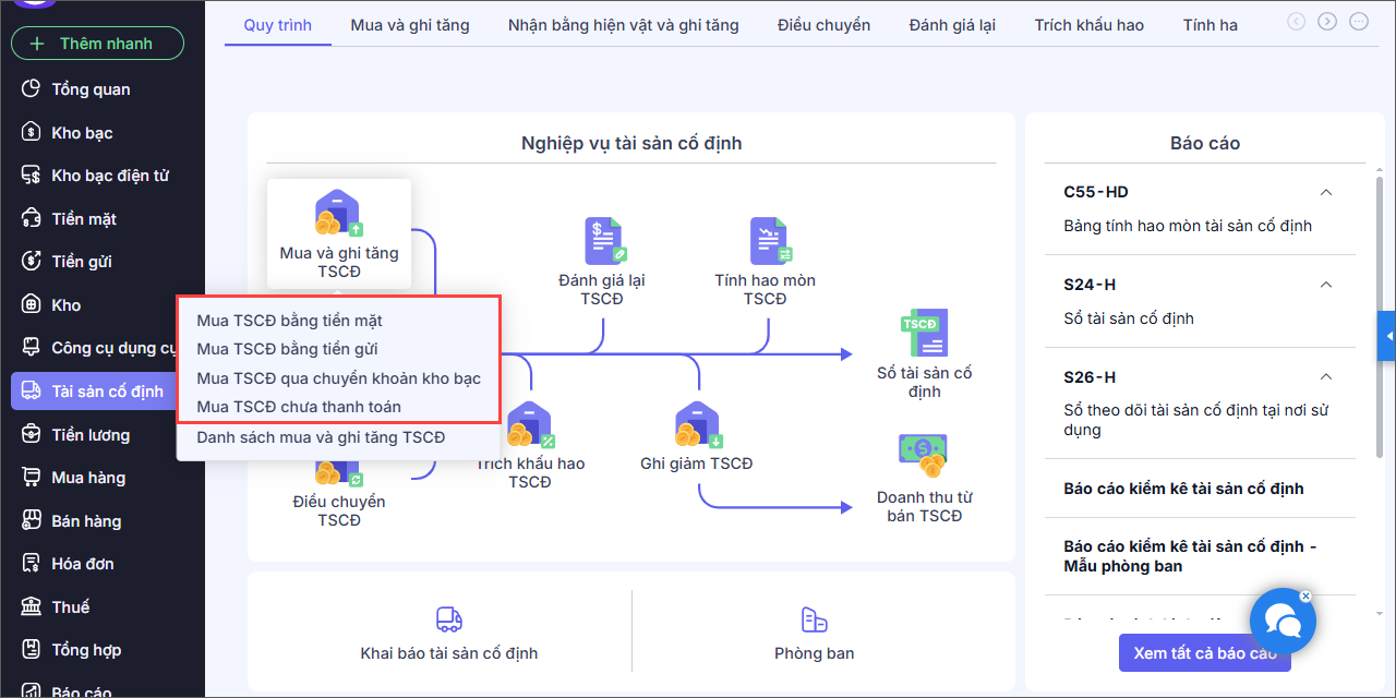 Hoặc vào nghiệp vụ Tài sản cố định\Mua và ghi tăng TSCĐ.