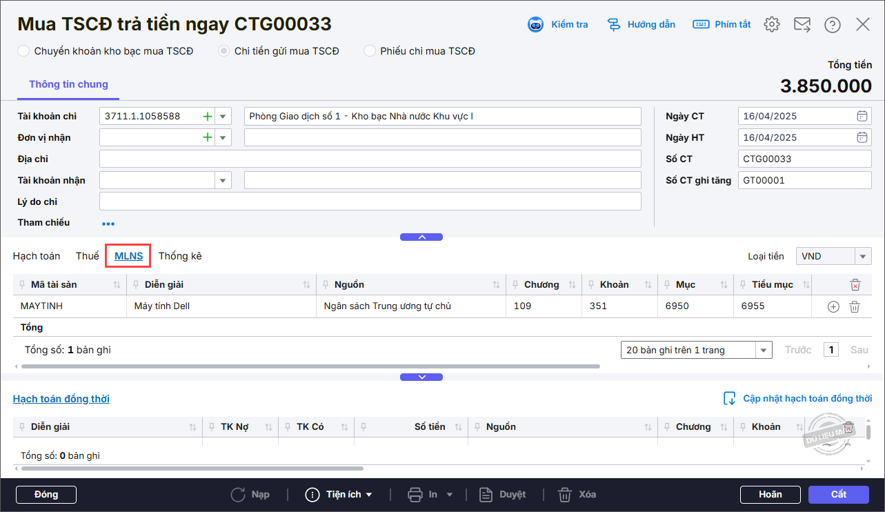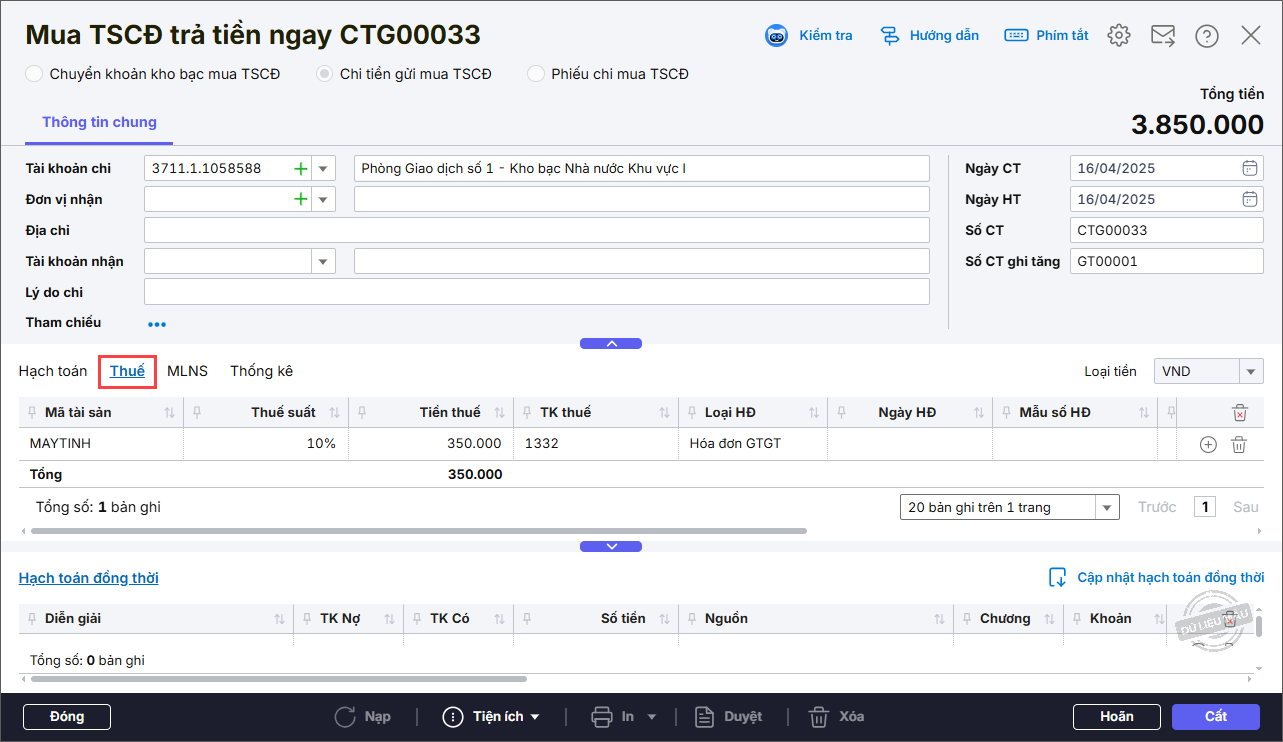 - Trường hợp mua TSCĐ bằng chuyển khoản: sinh Chuyển khoản kho bạc mua tài sản cố định.