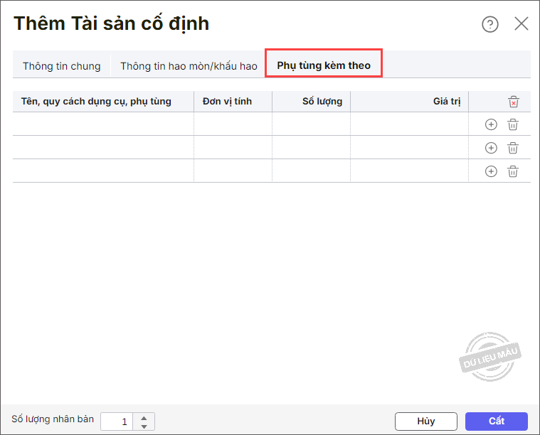 Lưu ý: Nếu muốn thêm nhiều tài sản giống nhau, nhập số lượng tại ô Số lượng nhân bản.