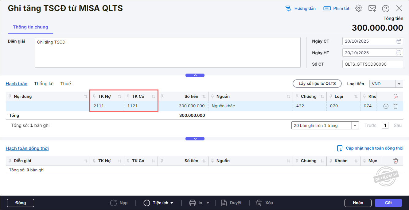 Bài viết hướng dẫn anh chị cách hạch toán và các bước thực hiện trên phần mềm khi thực hiện mua TSCĐ (Theo dõi trên MISA QLTS) bằng bằng nguồn khác ( Nguồn thu SXKD, nguồn thu học phí, viện phí, … ). Quy trình này đảm bảo việc ghi nhận, hạch toán và kết nối số liệu giữa MISA QLTS và MISA Mimosa Online được thực hiện chính xác, phù hợp với quy định kế toán hiện hành.