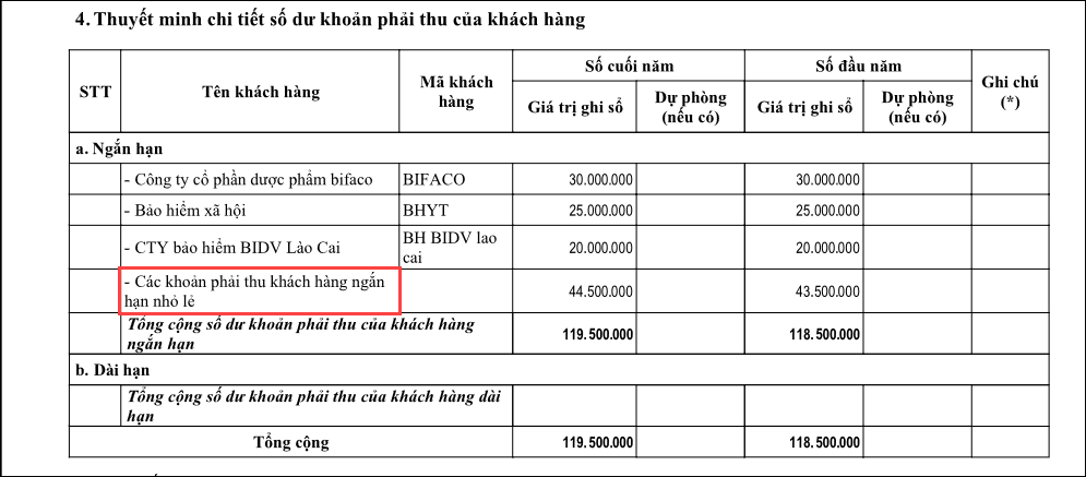 Bài viết này giúp anh/chị giải đáp được thắc mắc khi xem  báo cáo B04/BCTC: Thuyết minh báo cáo tài chính thấy chỉ tiêu III.4 Thuyết minh chi tiết số dư các khoản phải thu ngắn hạn và dài hạn có hiển thị 1 dòng tên khách hàng là “Các khoản phải thu khách hàng ngắn hạn nhỏ lẻ”.