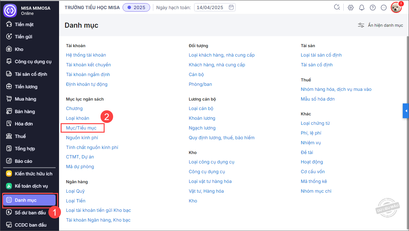 Bước 1: Vào menu Danh mục, chọn Mục/Tiểu mục.