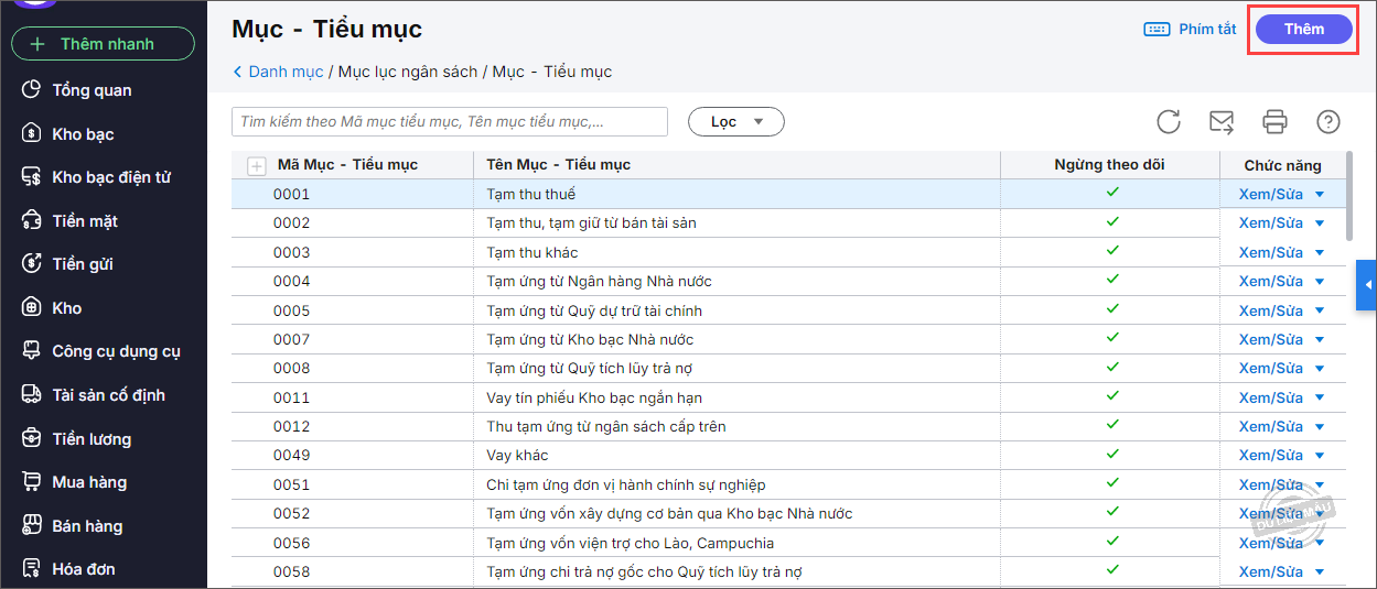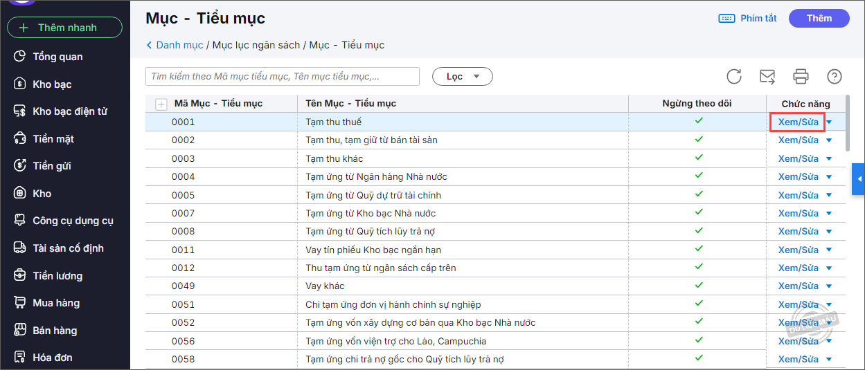 Lưu ý: Nếu Mục/Tiểu mục đã có phát sinh bạn cần sửa các phát sinh về tiểu mục đúng trước rồi mới thực hiện xóa.