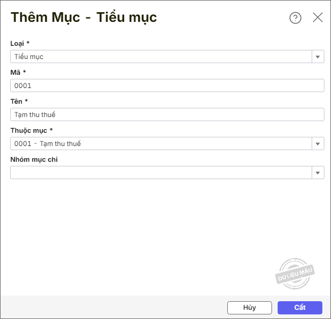 - Thuộc mục: Xác định chỉ tiêu thêm mới thuộc Nhóm, Tiểu nhóm hay Mục nào. Ô này sẽ thay đổi hoặc không xuất hiện tùy theo việc chọn loại của chỉ tiêu thêm mới là Nhóm, Tiểu nhóm, Mục, Tiểu mục hay tiết tiểu mục.