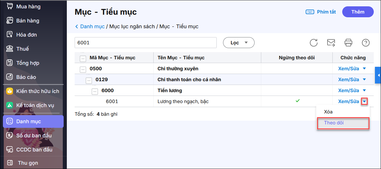 Bước 3: Nếu trong danh mục Mục, Tiểu mục đã có thì tích vào biểu tượng mũi tên và chọn nhấn Theo dõi.