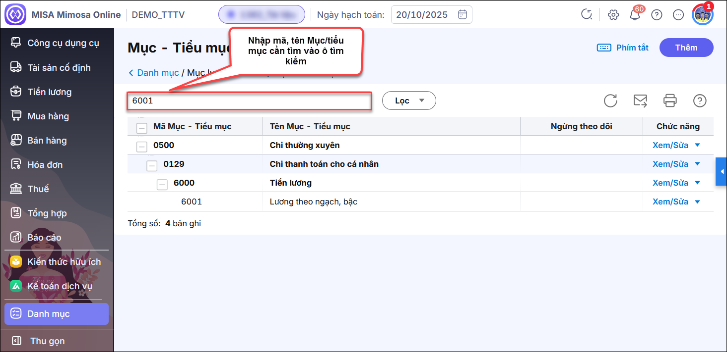 Bước 2: Nhập mã hoặc tên Mục/Tiểu mục cần tìm vào ô tìm kiếm để tìm.