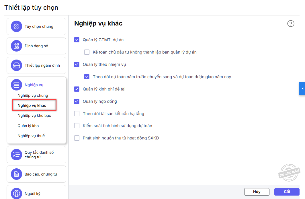 Trên phần Nghiệp vụ chung, phần mềm cho phép thiết lập các nghiệp vụ cơ bản, đặc thù theo loại hình đơn vị, ẩn/hiện nghiệp vụ trên thanh nghiệp vụ.