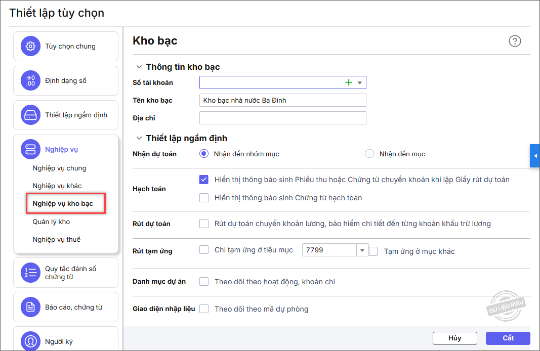 Trên phần Nghiệp vụ kho bạc, phần mềm cho phép thiết lập các thông tin kho bạc, hạch toán và rút dự toán, tạm ứng, theo dõi dự án, mã dự phòng…