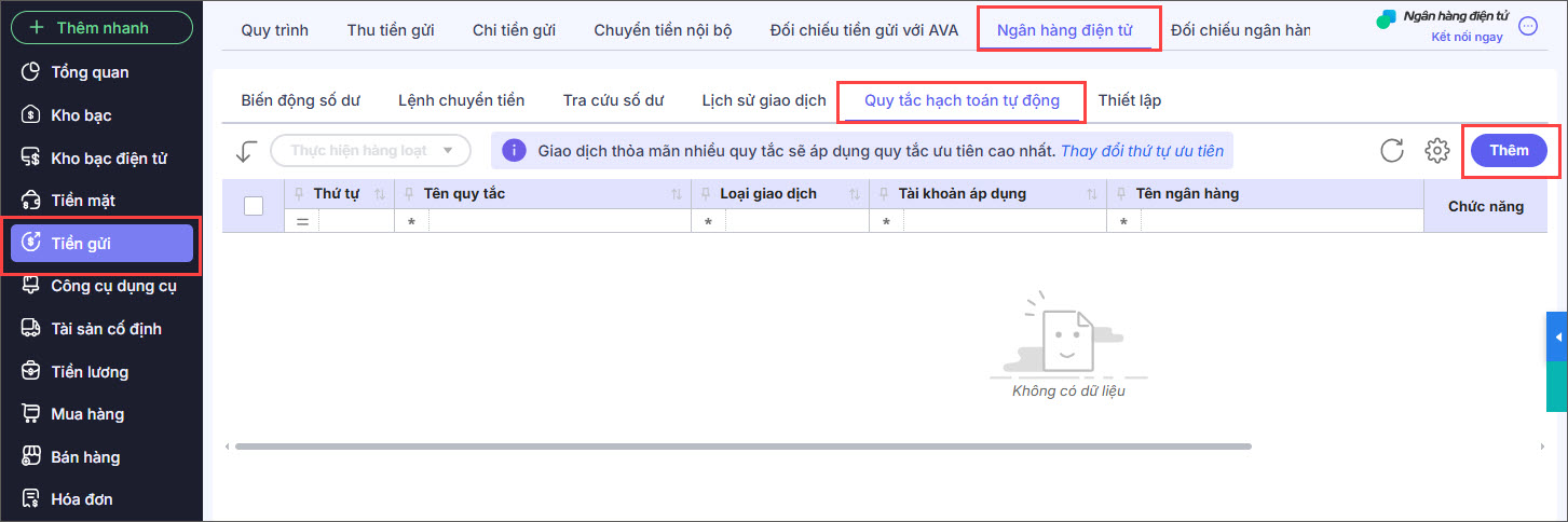 Bước 1: Vào mục Tiền gửi\Ngân hàng điện tử\Thiết lập quy tắc hạch toán tự động.