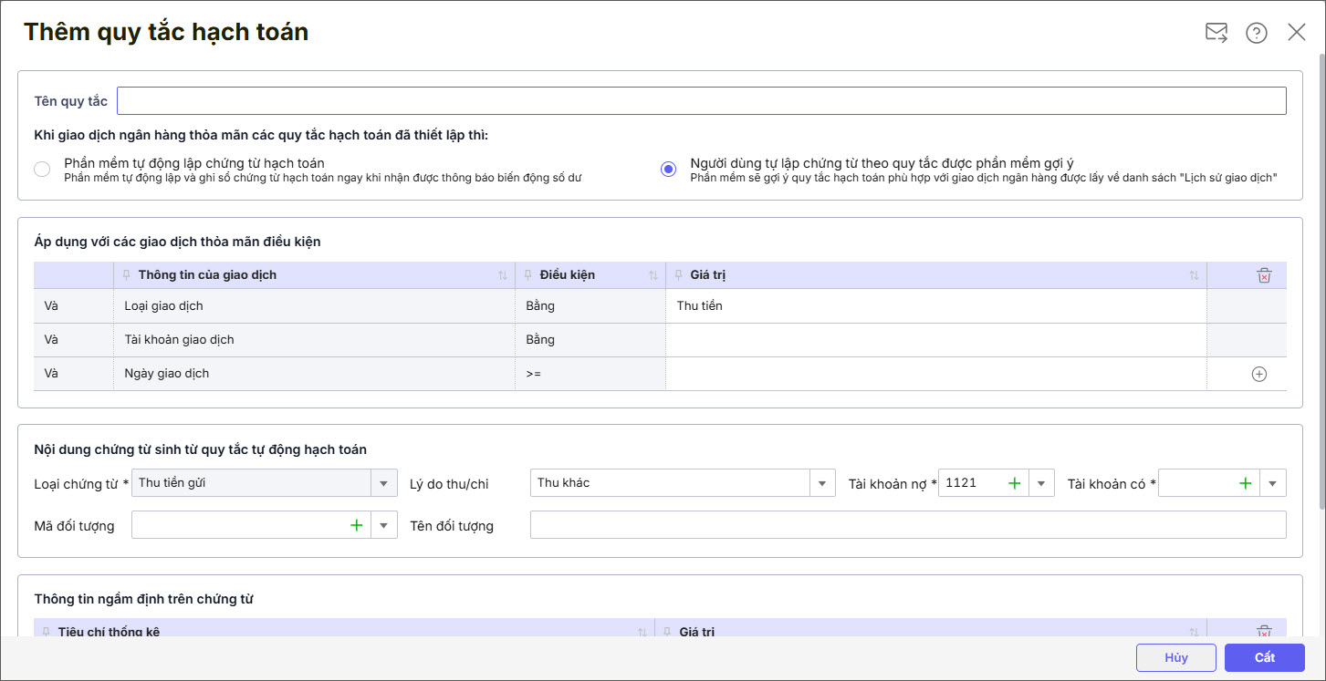 • Nếu tích chọn Phần mềm tự động lập chứng từ hạch toán: Các giao dịch thỏa mãn quy tắc sẽ tự động sinh chứng từ và không ghi sổ.