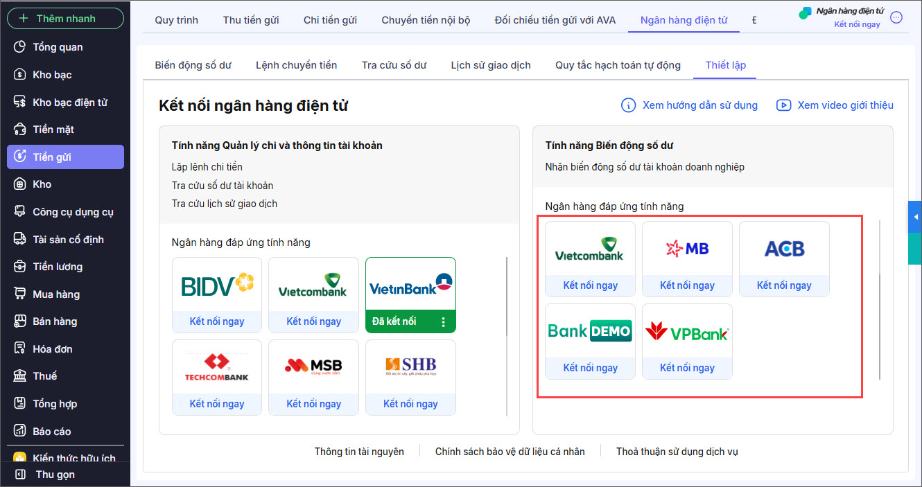 Bước 2: Trên danh sách các ngân hàng đáp ứng tính năng Nhận biến động số dư, nhấn Kết nối ngay tại ngân hàng cần kết nối.