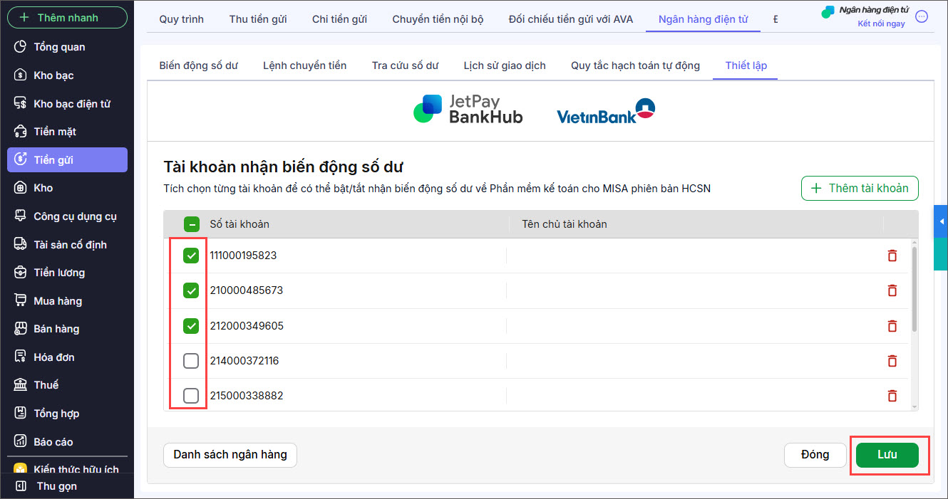 Bước 4: Tích chọn thông tin các số tài khoản muốn nhận biến động số dư, sau đó nhấn Lưu.