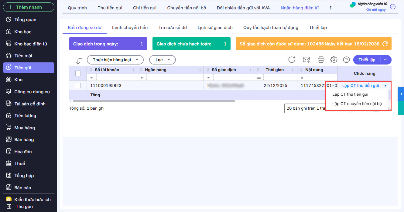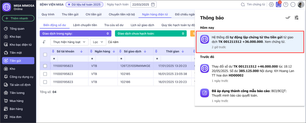 6. Nhận biến động số dư tài khoản ngân hàng tức thời và tự động hạch toán