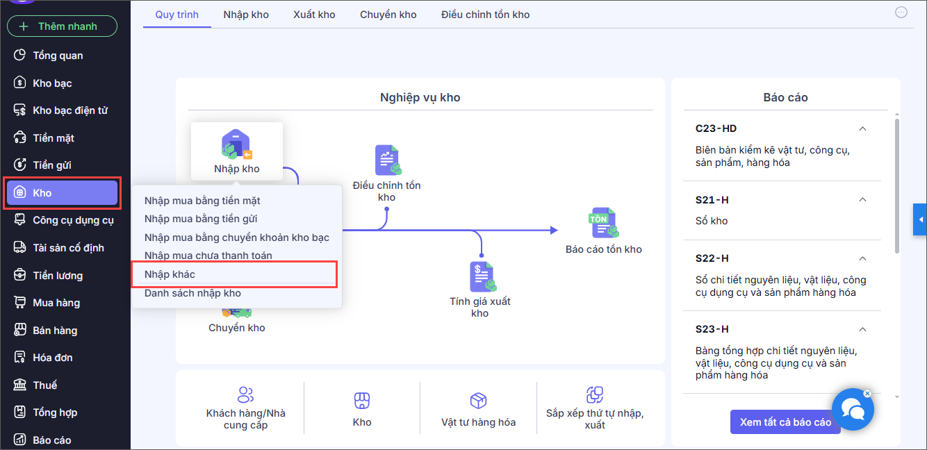 Bước 1: Vào menu Kho, chọn Nhập kho\Nhập khác.