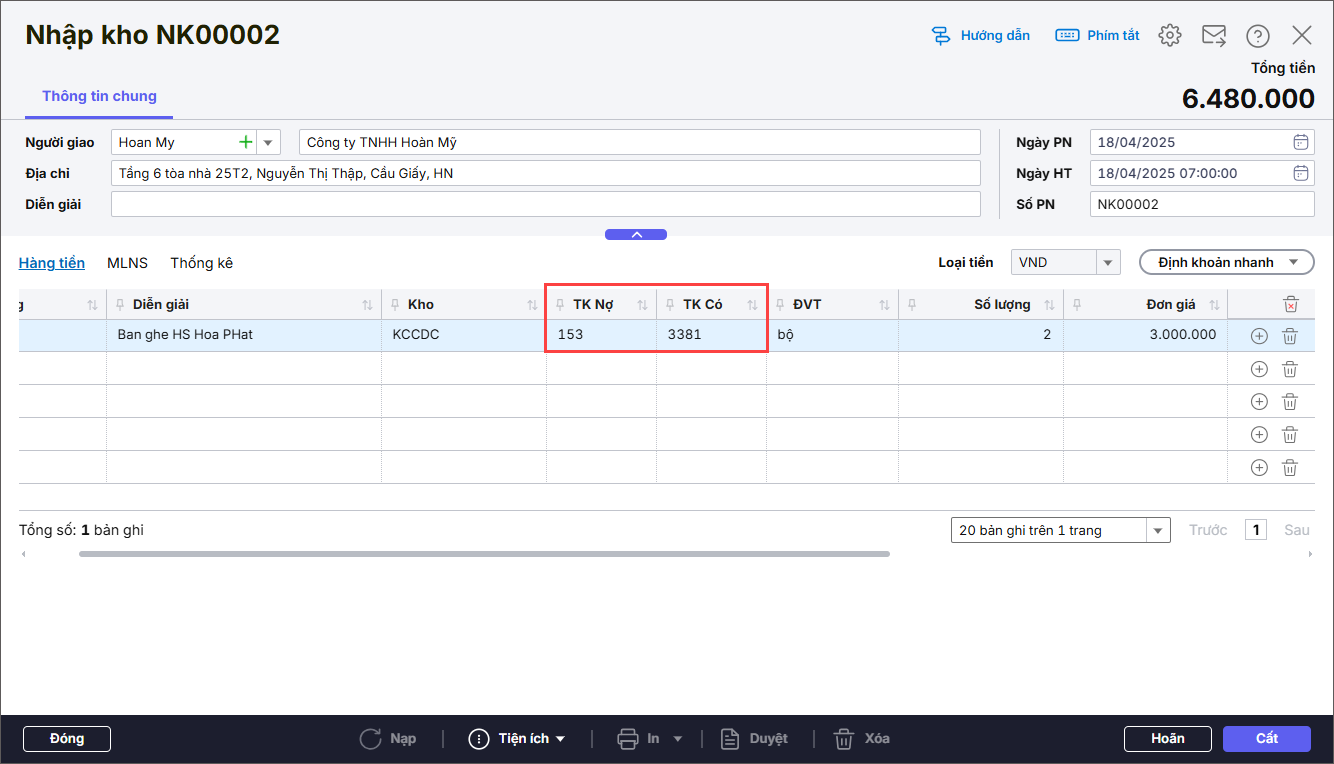 - Nhập thông tin chung: Người giao, Địa chỉ, Diễn giải.