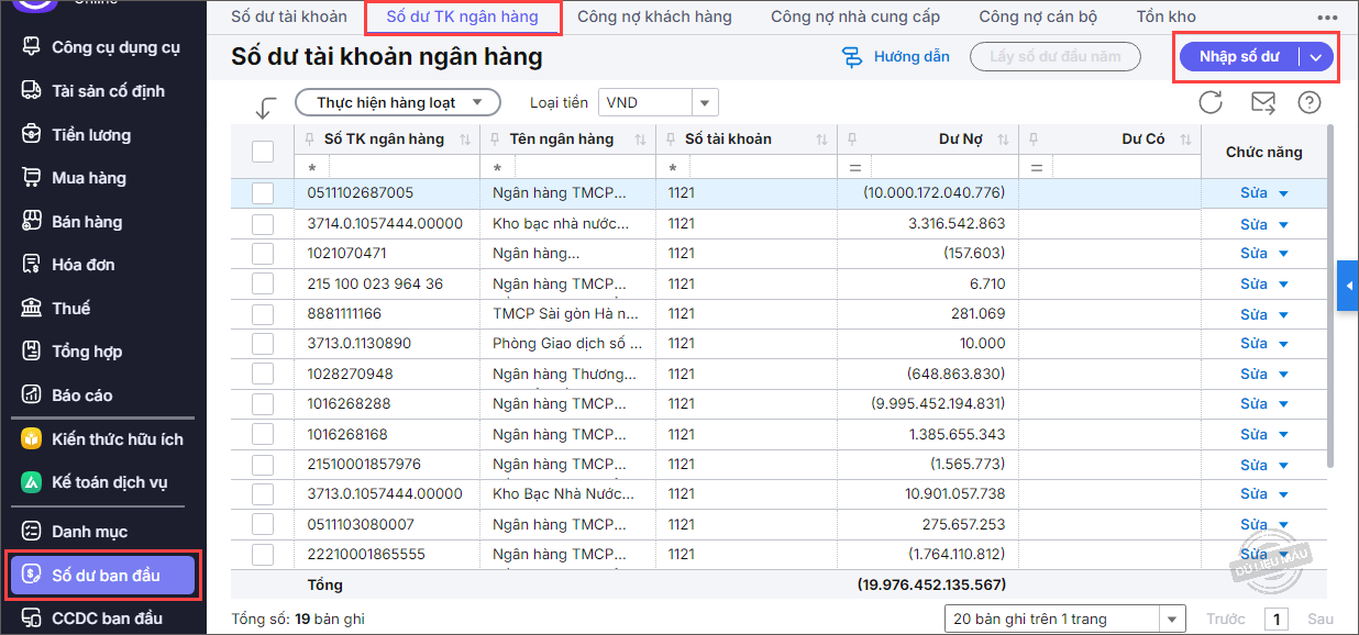 Nhập số dư tài khoản ngân hàng