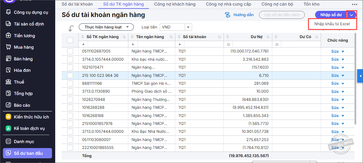 Nội dung bài viết gồm: Khai báo Danh sách tài khoản Ngân hàng, cách nhập số dư đầu kỳ trường hợp nhập bằng tay hoặc nhập khẩu số dư từ excel
