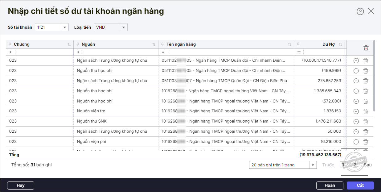 Bước 4: Nhập số dư chi tiết số dư tài khoản ngân hàng