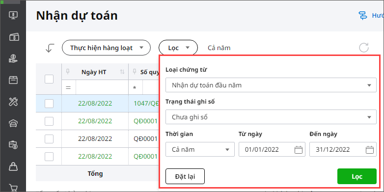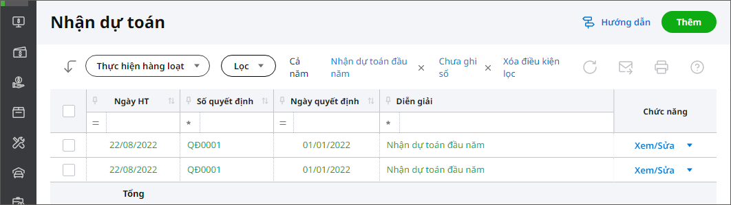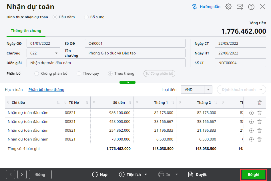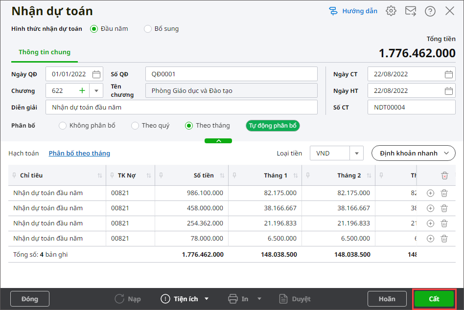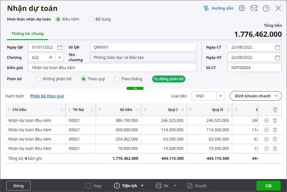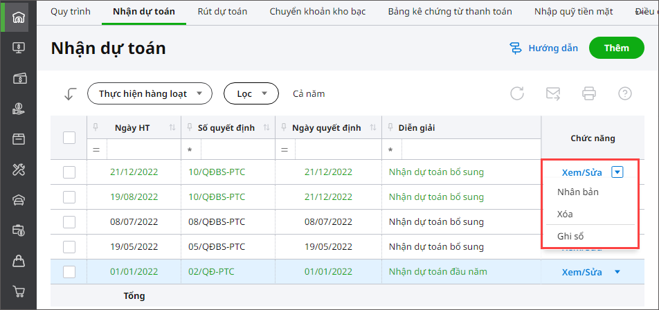 Lưu ý: Hướng dẫn này cụ thể cho danh sách chứng từ Nhận dự toán, danh sách rút dự toán, chuyển khoản kho bạc, nhập quỹ tiền mặt, … anh chị thao tác tương tự