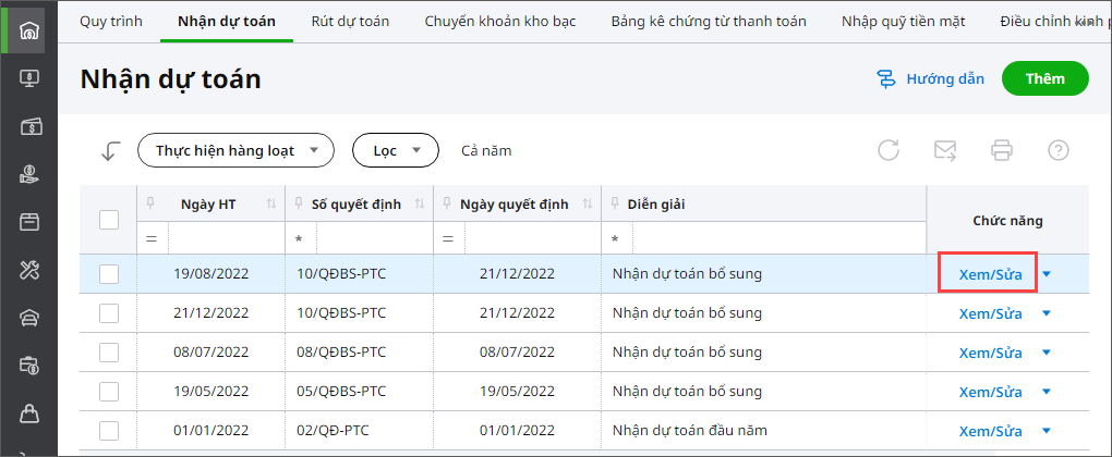 Bước 1. Kích đúp chuột hoặc nhấn Xem/Sửa tại chứng từ nhận dự toán cần sửa.