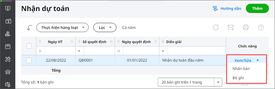 Để thực hiện ghi sổ/bỏ ghi sổ 1 chứng từ, anh/chị nhấn vào dấu mũi tên cạnh chức năng Xem/Sửa tại chứng từ đó, chọn Ghi sổ/Bỏ ghi.