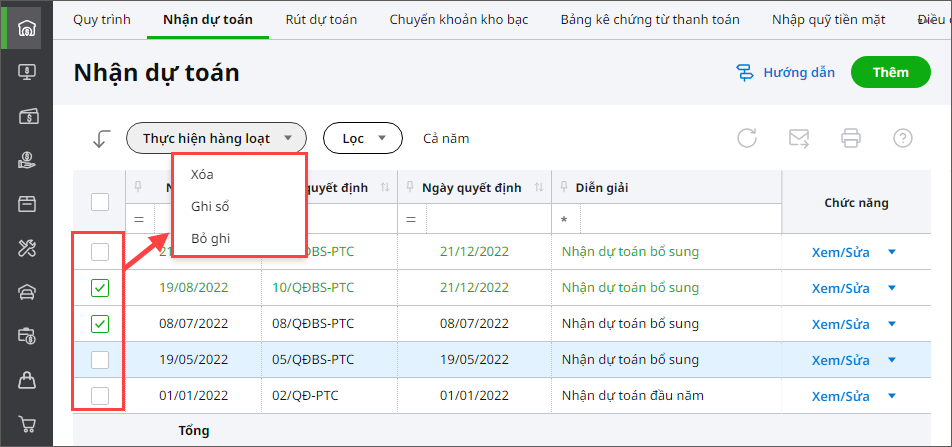 - Bước 2: Nhấn Thực hiện hàng loạt. Chọn Ghi sổ/Bỏ ghi.