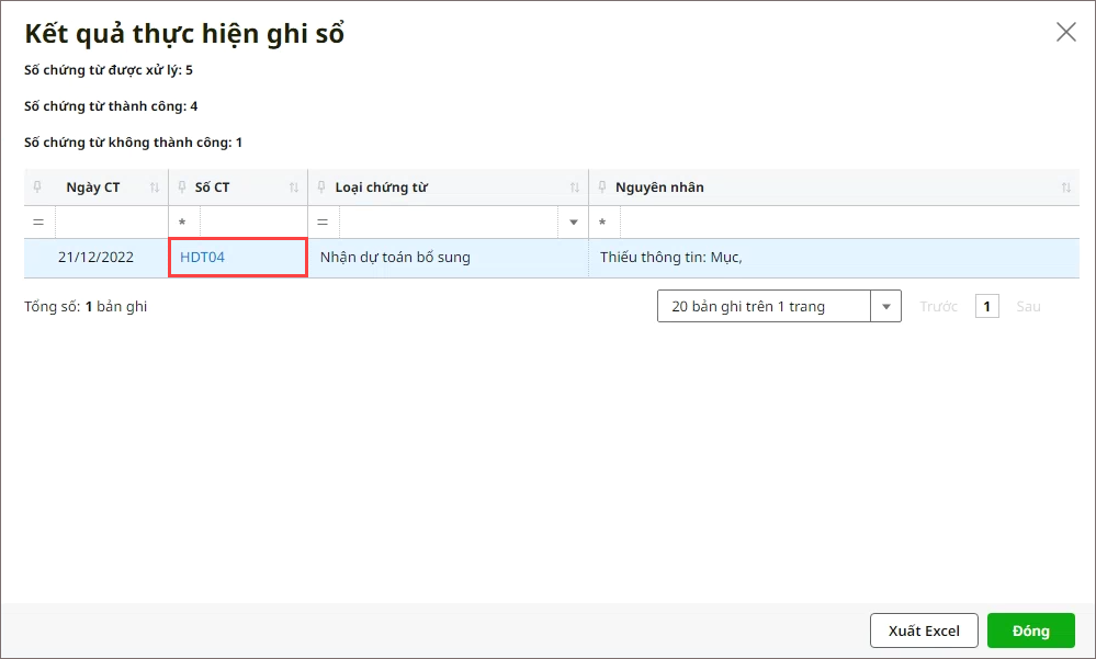 - Trường hợp không ghi sổ/bỏ ghi được, phần mềm sẽ hiển thị chứng từ không ghi sổ thành công và nguyên nhân. Anh/chị chọn vào Số CT cụ thể để xem chi tiết.
