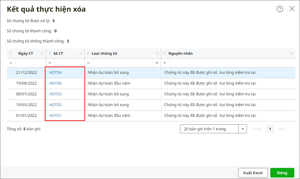 * Lưu ý: Trường hợp không xóa được, phần mềm sẽ hiển thị chứng từ không xóa thành công và nguyên nhân. Anh/chị có thể chọn vào Số CT cụ thể để xem chi tiết.