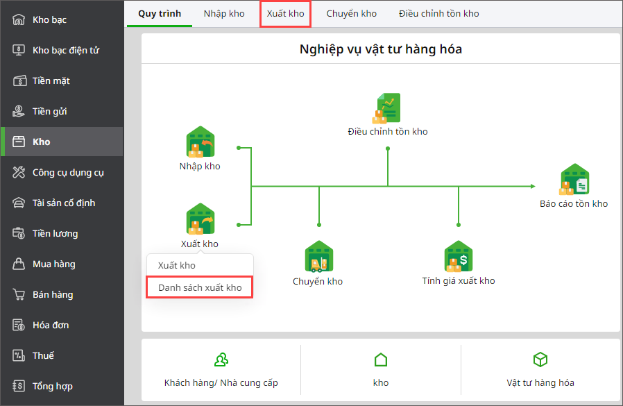 Bước 1: Vào nghiệp vụ Kho, chọn Xuất kho\Danh sách xuất kho hoặc vào tab Xuất kho.