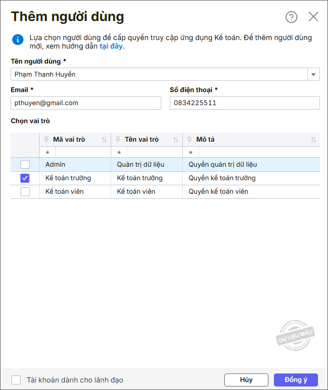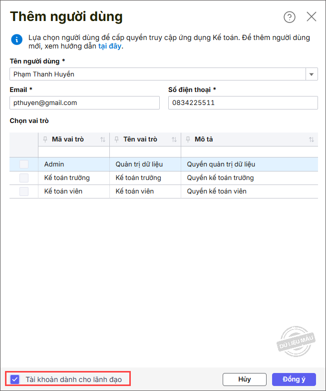 Bước 5: Trường hợp muốn thực hiện thêm tài khoản dành cho lãnh đạo, tích chọn Tài khoản dành cho lãnh đạo. Nhấn Đồng ý.