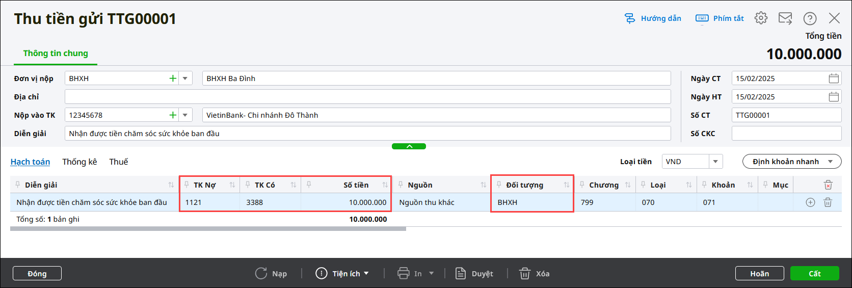 Ví dụ: Đơn vị nhận số tiền 10.000.000 đồng bằng tiền gửi để chi hộ