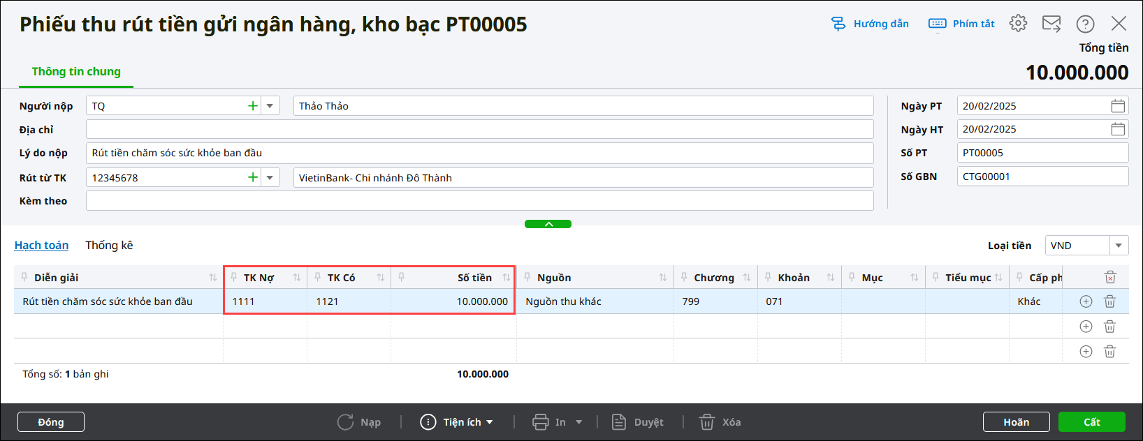 • Tại tab Hạch toán: định khoản TK Nợ 111, TK Có 1121, Nguồn là Nguồn khác, Cấp phát KhácNghiệp vụ để là Thực chi hoặc Không chọn.