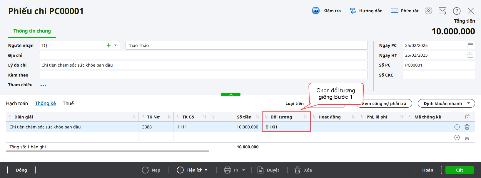 • Tại tab Hạch toán: định khoản TK Nợ 3388, TK Có 1111, Nguồn là Nguồn khác, Cấp phát KhácNghiệp vụ để là Thực chi hoặc Không chọn.