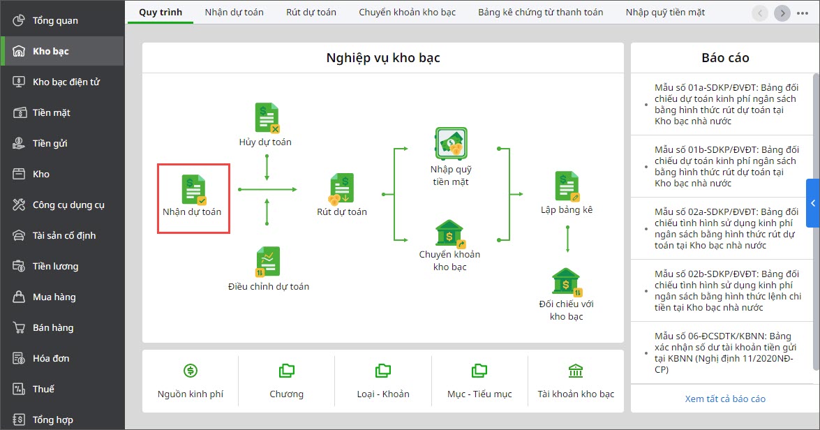 Bước 2: Vào nghiệp vụ Kho bạc, chọn lập chứng từ Nhận dự toán.