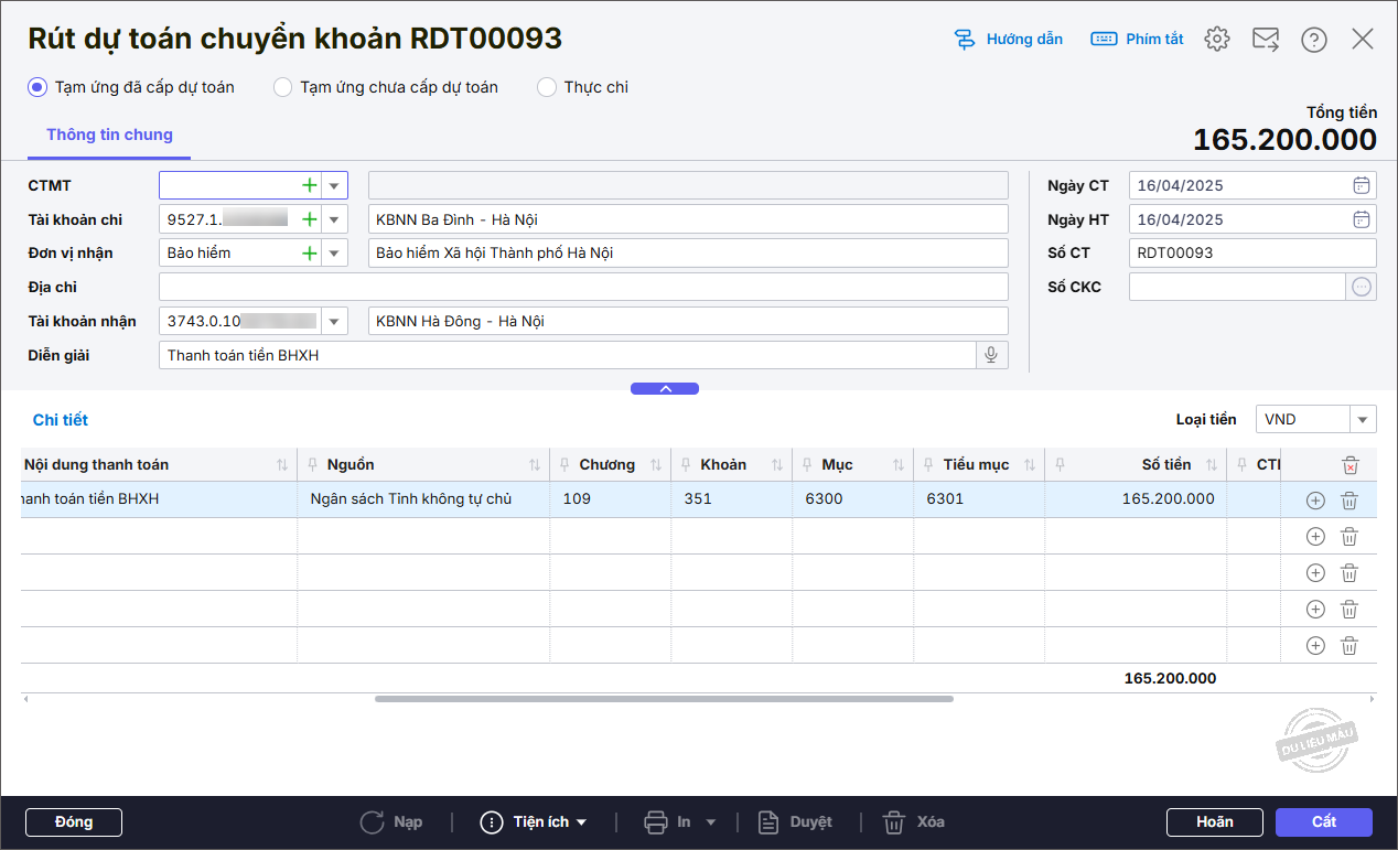 - Nhập thông tin chung: Tài khoản chi, Đơn vị nhận, Diễn giải.