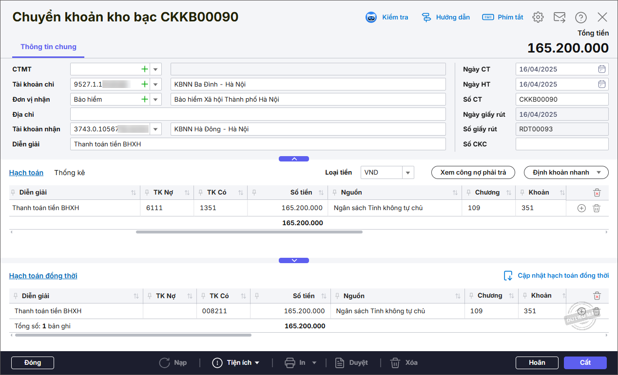- Kiểm tra lại thông tin trên chứng từ Chuyển khoản kho bạc vừa sinh từ Rút dự toán chuyển khoản.