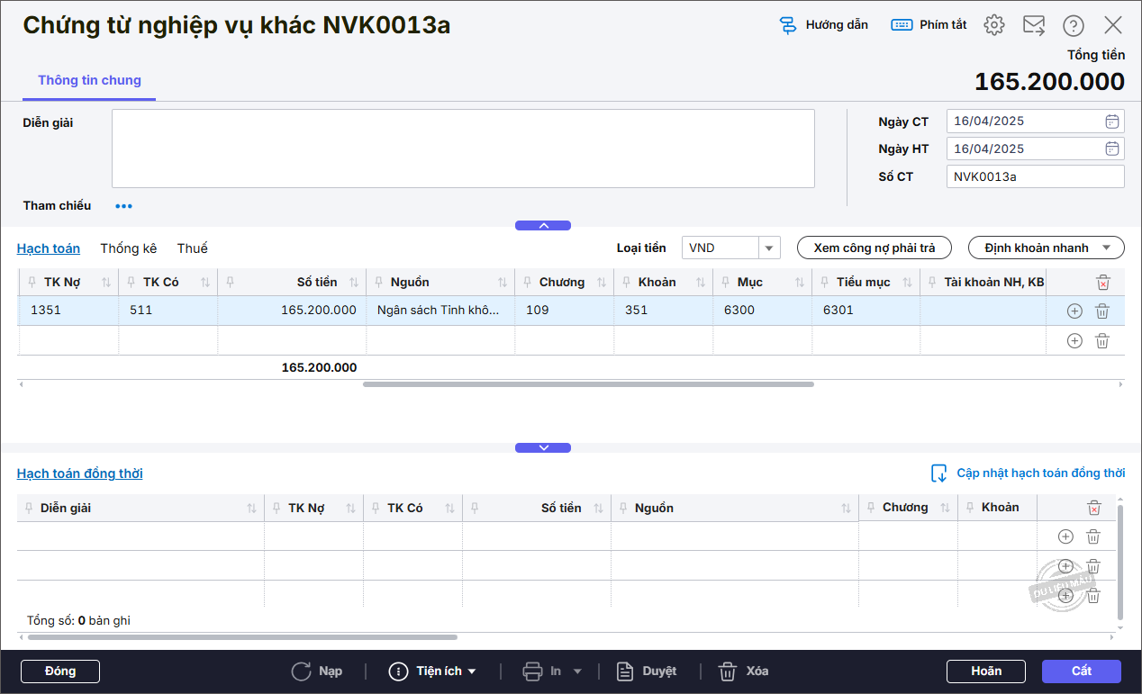 - Hệ thống sinh chứng từ đồng thời tại tab Hạch toán đồng thời.