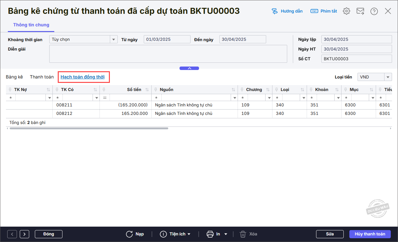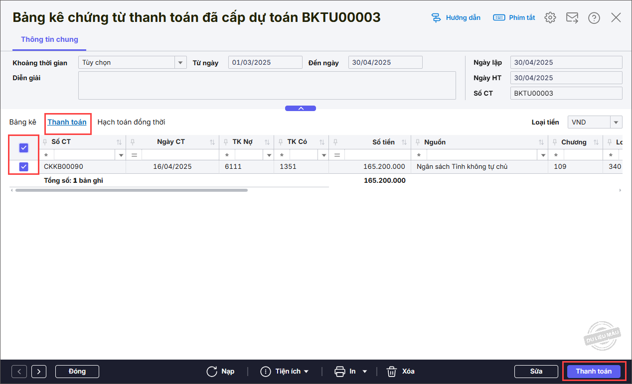 - Tích chọn Tạm ứng đã cấp dự toán.